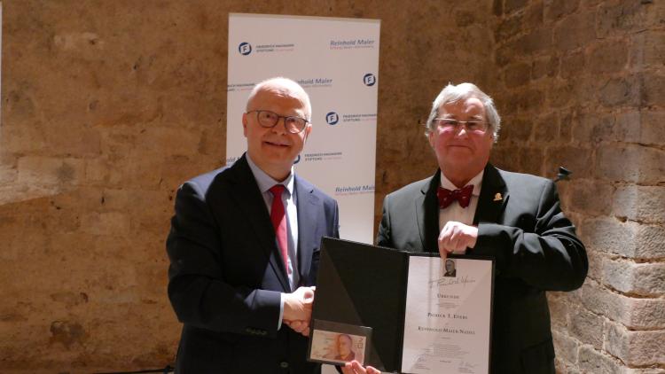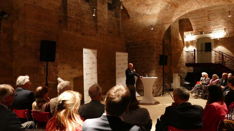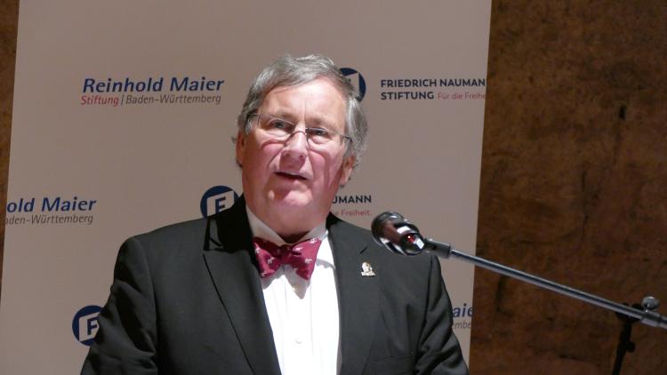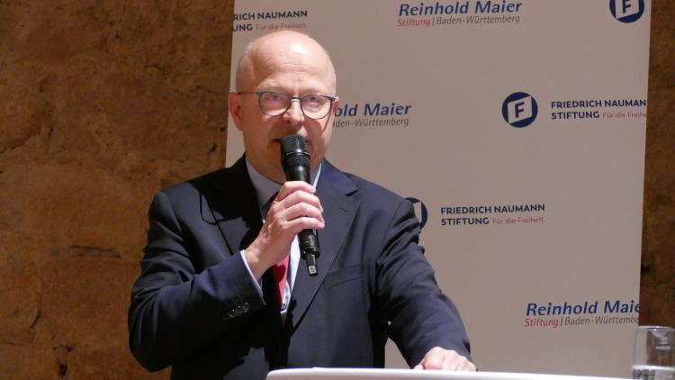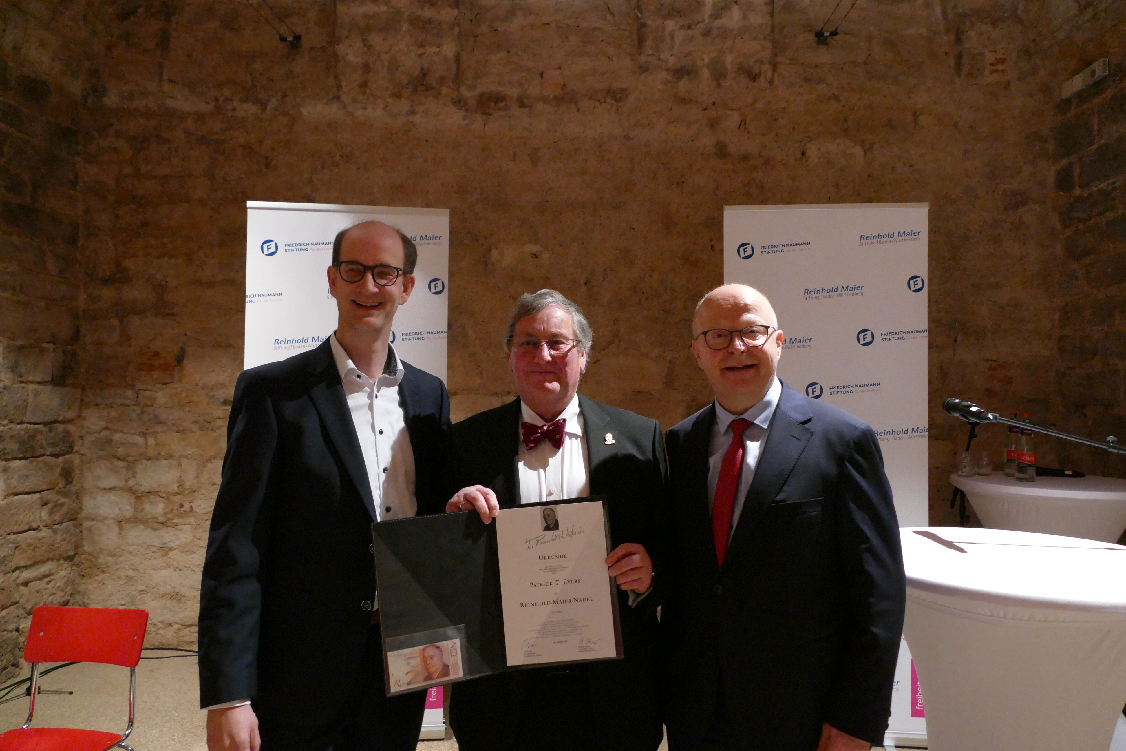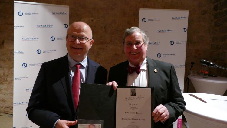 Die Laudatio hielt Michael Theurer MdB, Parlamentarischer Staatssekretär beim Bundesminister für Digitales und Verkehr, Vorsitzender der Freien Demokraten Baden- Württemberg sowie Mitglied des Verwaltungsrates der Reinhold-Maier-Stiftung. Grußworte sprachen Sascha Fiek, Vorsitzender der Fraktion Freie Demokraten/Bürger für Freiburg im Freiburger Gemeinderat, Maria Viethen, Fraktionsvorsitzende der Grünen im Freiburger Gemeinderat, und Brigitte Bornschein, eine Weggefährtin von Patrick T. Evers.