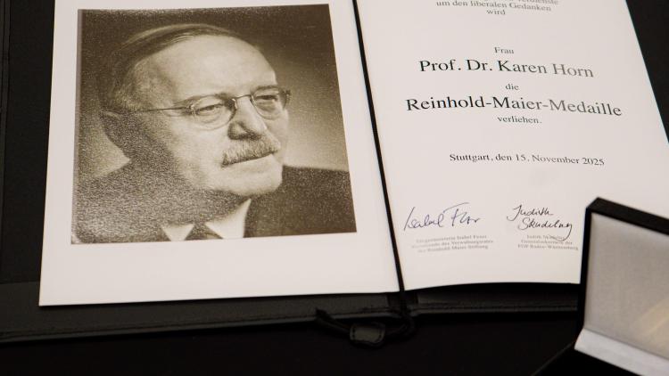 Die Ökonomin und Publizistin Prof. Dr. Karen Horn wurde am Samstag, den 15. November 2025 in Stuttgart von der Reinhold-Maier-Stiftung Baden-Württemberg mit der Reinhold-Maier-Medaille ausgezeichnet.
