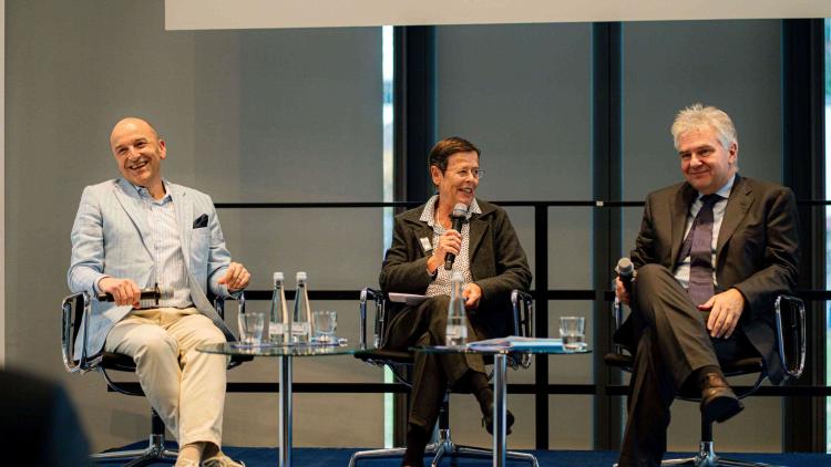 Ein besonderes Format setzte einen weiteren Höhepunkt in der Tagesordnung, indem sich mit Christoph Daniel Maier und Ludwig Theodor Heuss die Nachkommen in der Enkelgeneration der beiden bedeutenden liberalen Staatsmänner aus dem deutschen Südwesten zu einem von der Landesjournalistin Bettina Wieselmann moderierten Gespräch fanden und zum augenblicklichen Zustand der freiheitlichen Demokratie austauschten. Diese sei, wie die Moderatorin befand, derzeit unter starkem Druck. Das unterstrich auch Heuss, nicht ohne jedoch ausdrücklich davor zu warnen, sich jetzt zurückzuziehen und nicht mehr aktiv an der Politik mitzuwirken. Maier, der an seinem Wohnort in der Schweiz auch für die dortige FDP kommunalpolitisch aktiv ist, setzte der Verzagtheit – ganz in der Tradition Reinhold Maiers – die „Graswurzeldemokratie“ entgegen, also das Bewusstsein, dass Demokratie vor Ort anfange und es besonders darauf ankäme (und schließlich auch lohne), dort etwas zu bewirken. Die immer schwierigere Findung gemeinsamer politischer Mehrheiten zur Lösung von Problemen wurde von Wieselmann thematisiert und diesen Bedenken schlossen sich auch ihre beiden Podiumsgäste an. Die Notwendigkeit von Kompromissen sei in Deutschland in Verruf geraten, konstatierten sie und riefen besonders die Liberalen dazu auf, Gemeinsamkeiten zu suchen und zu finden. Hauss mahnte die Liberalen zur Eintracht nach dem Vorbild des schon seit vielen Jahrzehnten erfolgreichen Freisinns in der Schweiz. „Man muss sich für die Freiheit einsetzen, sie muss den Menschen ein Bedürfnis sein, für diesen Erfolg muss man aber auch kämpfen“, so der Appell Maiers und dem schloss sich Heuss an und begründete, warum sich dieser Einsatz lohne: „Der Liberalismus will den Menschen schließlich groß machen.“